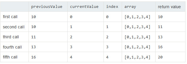 [0, 1, 2, 3, 4].reduce((previousValue, currentValue, index, array) => previousValue + currentValue, 10);