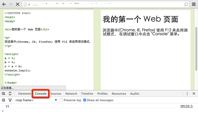 <!DOCTYPE html> <html> <body> <h1>我的第一个 Web 页面</h1> <script> a = 5; b = 6; c = a + b; console.log(c); </script> </body> </html>
