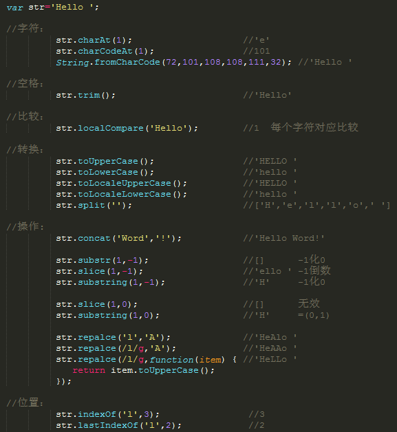 字符: charAt(位置) charCodeAt(位置) String. fromCharCode(多个字符编码)