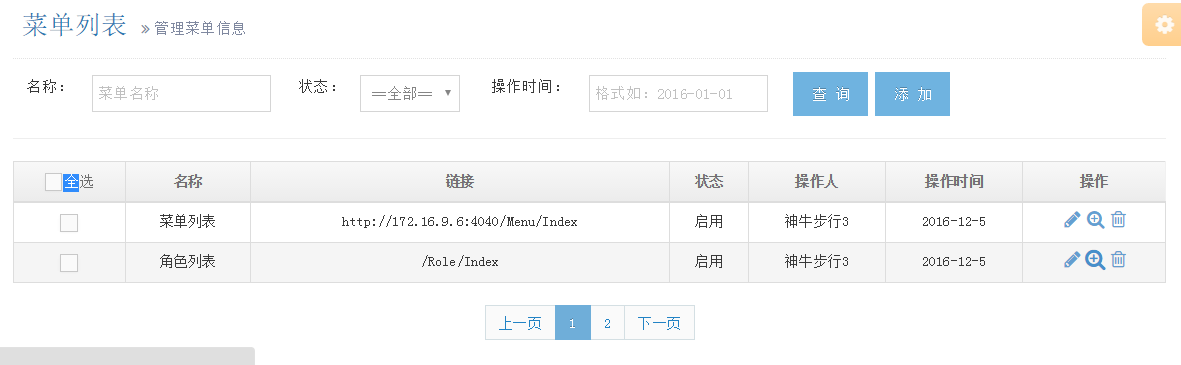 再来,咋们就开始使用shenniu.pager.js,我们需要在点击“查询”按钮的时候去调用这个插件,然后通过插件去获取后台接口返回的数据,并绑定到页面展示出来,所以有了如下代码: