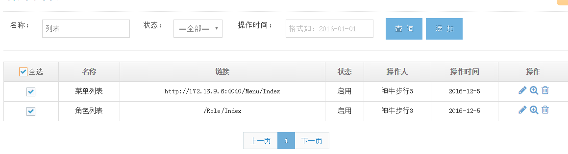 遍历json返回数据展示到table中(其中包括了时间格式化的处理,复选框,label及操作按钮类型operate的初始化)=》页数展示及事件绑定(目前只有上一页,当前页之前页码,当前页,当前页以后页码,下一页的效果展示,分页查询条件(生成pagesize和currentPage隐藏控件),绑定分页按钮事件)