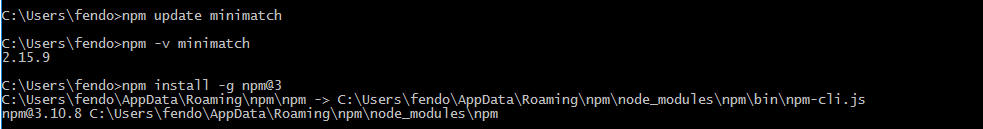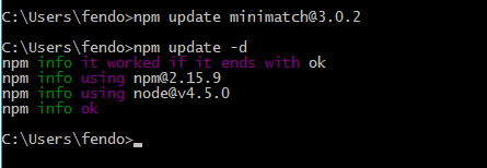 npm WARN deprecated minimatch@2.0.10: Please update to minimatch 3.0.2 or higher to avoid a RegExp DoS issue