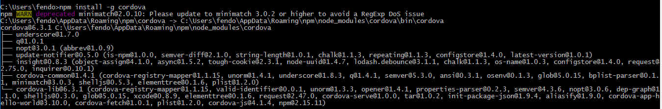 NPM 安装cordova时警告:npm WARN deprecated minimatch@2.0.10: Please update to minimatch 3.0.2 or higher to