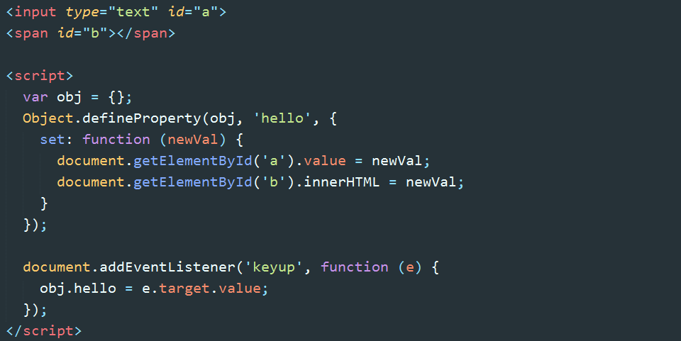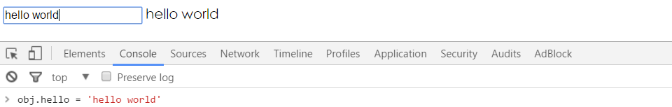 此例实现的效果是:随文本框输入文字的变化,span中会同步显示相同的文字内容;在js或控制台显式的修改obj.name的值,视图会相应更新。这样就实现了model =>view以及view => model的双向绑定,并且是响应式的。