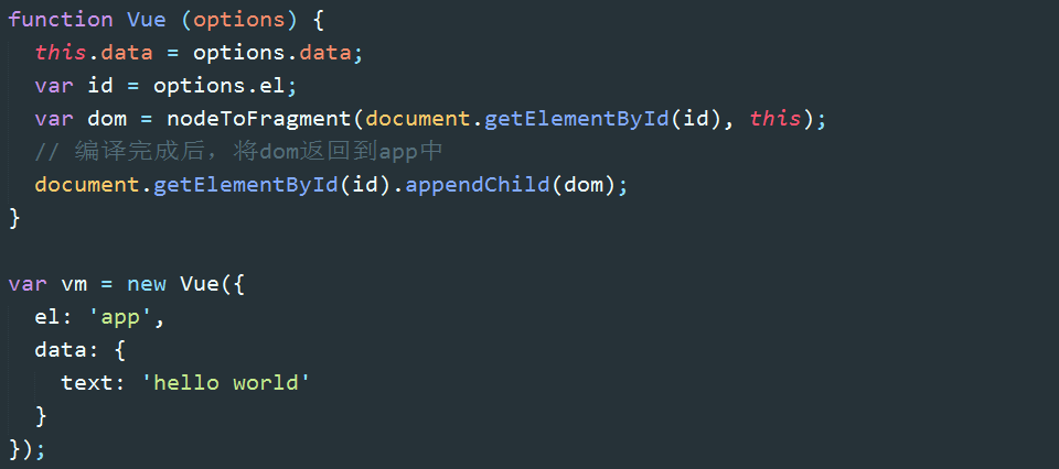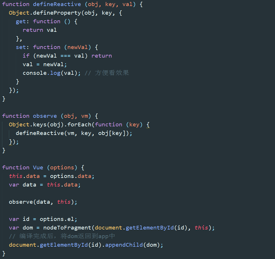 回顾一下,每当new一个Vue,主要做了两件事:第一个是监听数据:observe(data),第二个是编译HTML:nodeToFragement(id)。