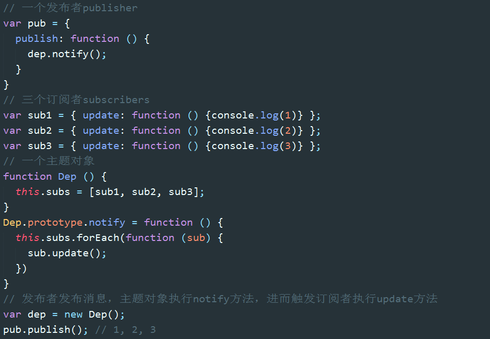 接下来我们要实现的是:发出通知dep.notify() => 触发订阅者的update方法 => 更新视图。