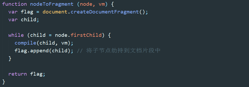 DocumentFragment(文档片段)可以看作节点容器,它可以包含多个子节点,当我们将它插入到DOM中时,只有它的子节点会插入目标节点,所以把它看作一组节点的容器。使用DocumentFragment处理节点,速度和性能远远优于直接操作DOM。Vue进行编译时,就是将挂载目标的所有子节点劫持(真的是劫持)到DocumentFragment中,经过一番处理后,再将DocumentFragment整体返回插入挂载目标。