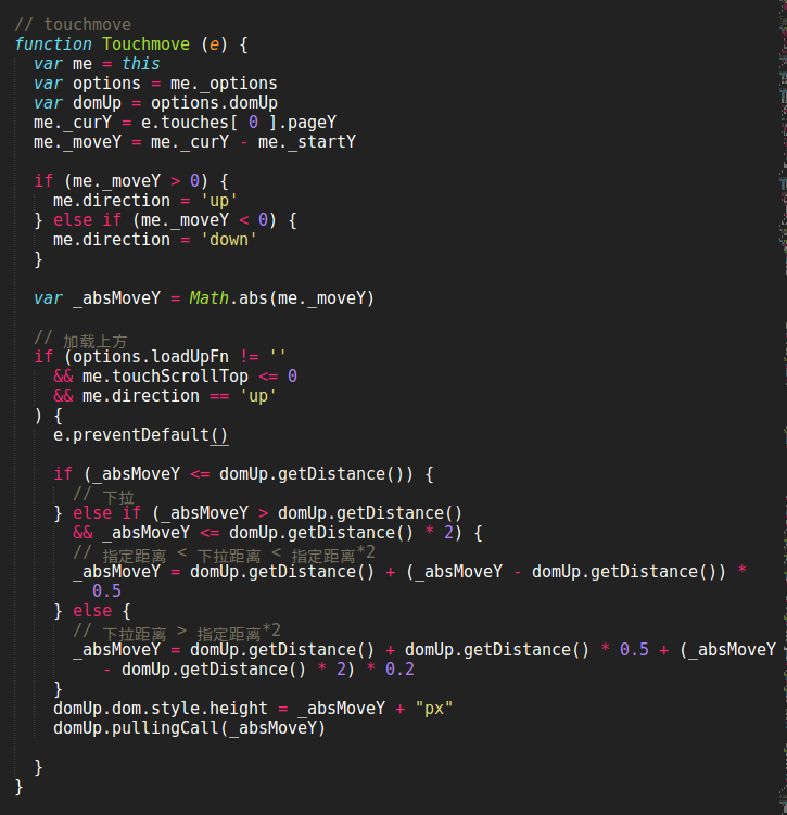 在touchmove里面,大家要注意,由于微信中的webview会存在黑底的问题,因此我们拉动列表的时候,会出现露出微信上方黑底的问题,因此,我们需要调用preventDefault方法,防止事件继续向上冒泡,从而防止用户在拖动列表的时候,微信上方出现黑底,那样会十分影响体验。