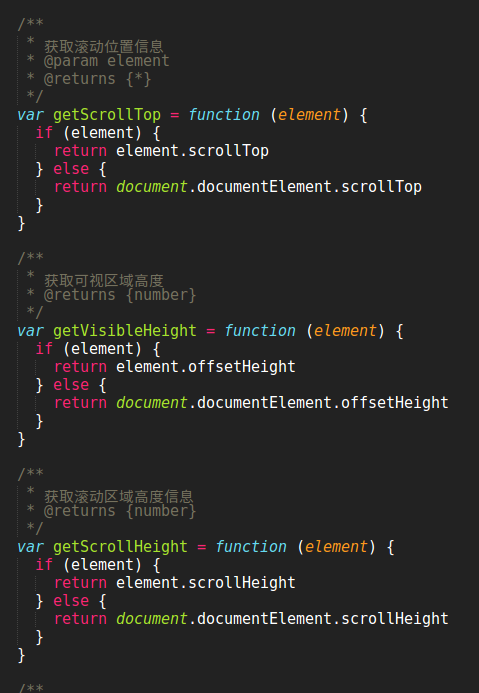 那么,在这里,我们会发现,当scrollTop + offsetHeight >= scrollHeight的时候,其实,我们的滚动条就已经到达最底部了,那么,滚动刷新触发的逻辑也就出来了,那么,这里会需要这样几个方法,来获取不同的高度元素