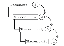 在事件捕获过程中,document 对象首先接收到click 事件,然后事件沿DOM 树依次向下,一直传播到事件的实际目标,即<div>元素。