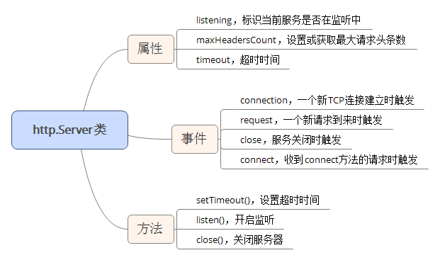 使用http.createServer([requestListener])方法创建一个http服务器,该方法返回一个新的http.Server实例,如果指定了requestListener,则会自动添加request事件。http.Server继承于net.Server,故默认拥有很多的属性、方法和事件,如下图所示(只给出部分):