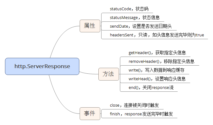 ServerResponse对象是HTTP server内部创建,并作为request事件监听函数的第二个参数,实现了可写流,决定返回给客户端的内容,属性如下所示: