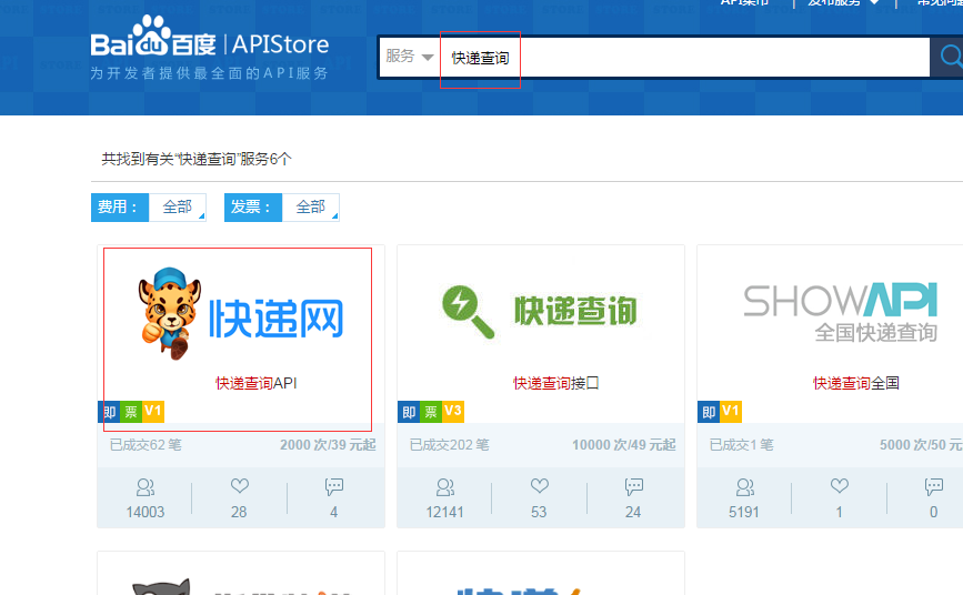 我们先找一个快递的api接口,通过http://apistore.baidu.com/我们可以看到很多的api,我们找一个快递查询的