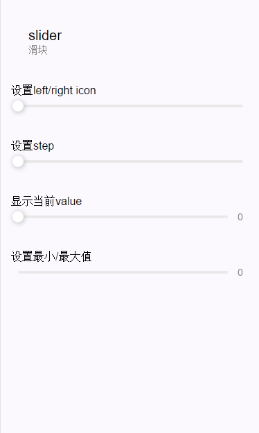 <view class="section section_gap"> <text class="section__title">设置left/right icon</text> <view class="body-view"> <slider bindchange="slider1change" left-icon="cancel" right-icon="success_no_circle"/> </view> </view> <view class="section section_gap"> <text class="section__title">设置step</text> <view class="body-view"> <slider bindchange="slider2change" step="5"/> </view> </view> <view class="section section_gap"> <text class="section__title">显示当前value</text> <view class="body-view"> <slider bindchange="slider3change" show-value/> </view> </view> <view class="section section_gap"> <text class="section__title">设置最小/最大值</text> <view class="body-view"> <slider bindchange="slider4change" min="50" max="200" show-value/> </view> </view>