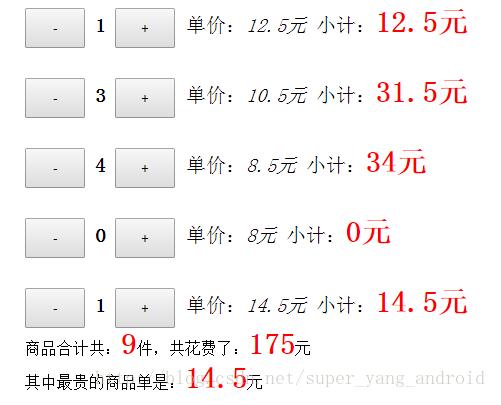 3、显示出总价,总数量和其中最贵的那个商品的价格。