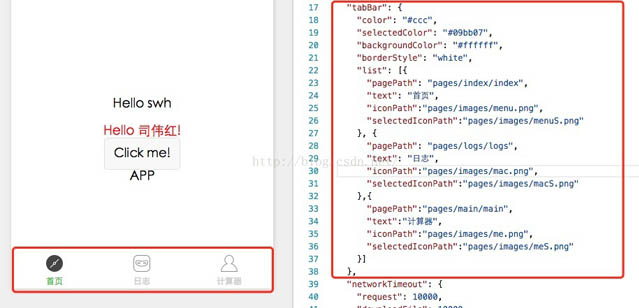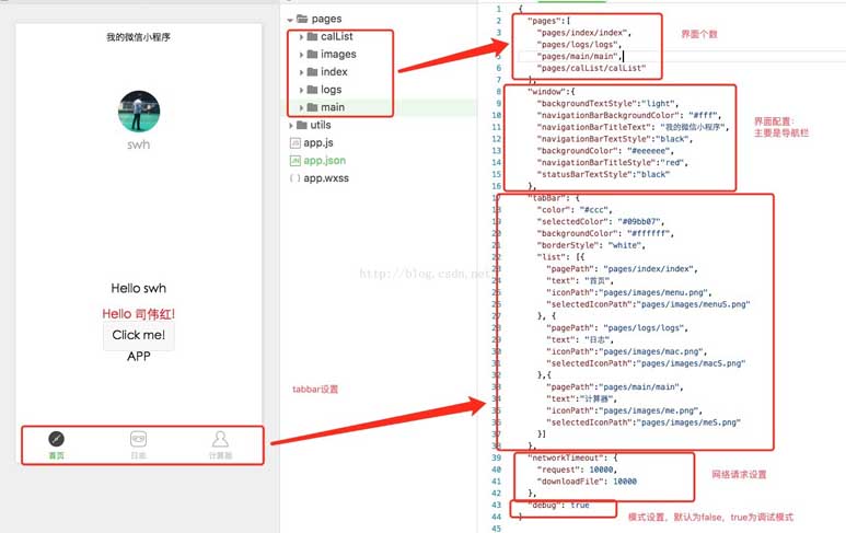 是一个数组参数,每一条数据代表一个页面,每次创建一个页面,必须在这边注册才能进行跳转和显示该页面,并且注册页面的时候不需要写文件的后缀名,这里我写了四个页面,index为主页面显示;logs页面显示小程序的访问日志;main这里为一个简单的计算器的界面;calList为计算结果日志页面。