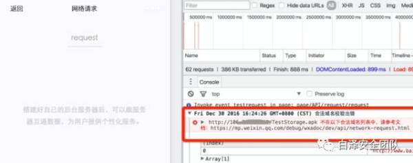 由后台配置小程序支持的域名,仅可访问已配置域名的url,校验过程会将配置的域名先下载到本地,然后每次请求时本地做域名检查通过后才发起。域名检查代码实现详见【附录4】,图10展示了域名不匹配进行错误请求的示例。