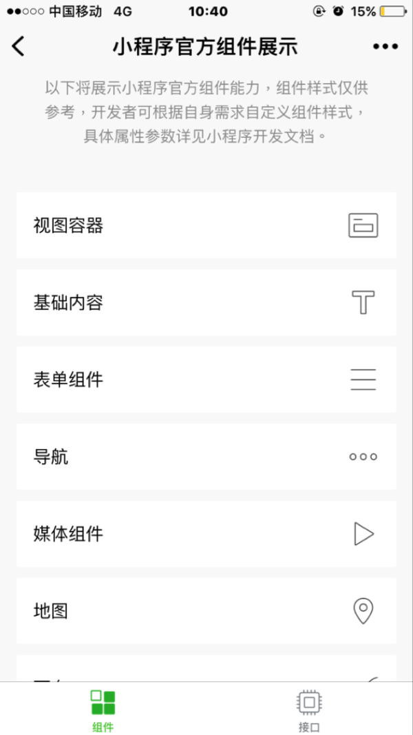 组件是框架提供的一系列基础模块,是视图层的基本组成单元,包含表单组件、导航、地图、媒体组件等常用元素,如图1说明当前小程序支持的的视图组件。