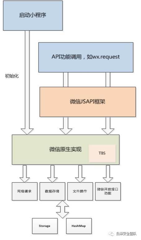 上图主要说明小程序功能逻辑框架流程,由顶层的小程序实现代码(类似js),到微信底层支撑实现模块的调用流程,通过微信JSAPI框架支撑页面到本地实现的桥接调用。小程序缓存数据存放在Storage中,对应文件为DB数据库;小程序文件操作通过Hash机制进行映射,并存储在外部存储空间。