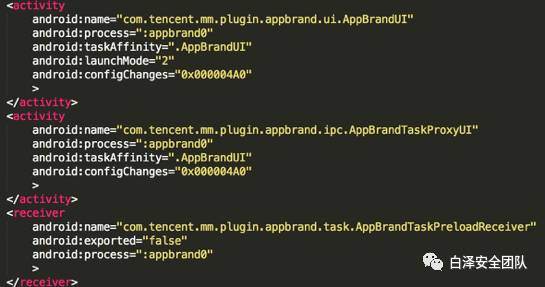 承载小程序展示的组件是.plugin.appbrand.ui.AppBrandUI、.plugin.appbrand.ui.AppBrandUI1、.plugin.appbrand.ui.AppBrandUI2、.plugin.appbrand.ui.AppBrandUI3、.plugin.appbrand.ui.AppBrandUI4,五个组件实现逻辑相同,AppBrandUI1- AppBrandUI4继承自AppBrandUI,图5为每个承载小程序的Android组件定义。