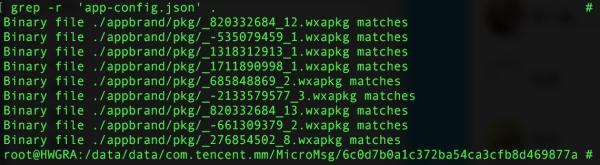 启动小程序检查是否需从服务端更新最新配置,如果需更新则下载最新配置到本地APP,如图7说明当前设备上已有使用的9个小程序的初始化数据,以二进制文件形式(后缀为.wxapkg)存放在APP目录下。在初始化阶段完成小程序的关键属性更新和配置,此部分属性配置完全由后端配置控制,在更新传输和本地存储被恶意篡改的可能性极低,提取配置信息的实现代码详见【附录2】。