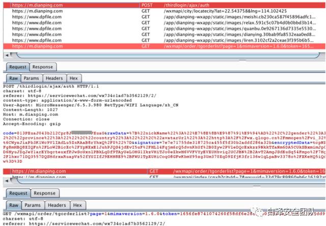 以上第一个请求通过code和微信基本用户信息到第三方服务器换取token,而后的请求通过token请求用户个人数据,如团购代金券使用历史记录。方式二不能将微信公众平台的appsecret或者session_key(属于敏感信息)传递到客户端,否则可能导致安全攻击。方式三属于小程序自身实现方式,依赖自身实现的安全性,与微信平台无关。