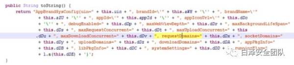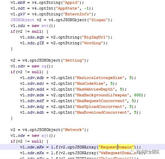 小程序后台控制的配置信息主要包括小程序名称、图标、最大webview深度、最大请求数、请求合法域名列表、下载合法域名列表和上传合法域名列表、socket合法域名列表以及APP包的基本信息等,动态加载的配置信息相关代码详见【附录1】