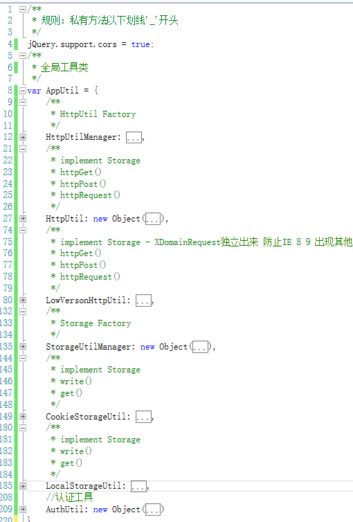 所以产生了两个JS对象,CookieStorageUtil对象,LocalStorageUtil对象。并且他们应该实现相同的“接口”,在这里我没有使用JS代码来模仿接口,而是采用注释的形式,标注两个对象需要实现相同的接口,实现接口中的两个方法write()和get()。并规范代码,下划线开头的为私有方法,这样一来今后修改内部代码的时候,私有方法随便改,对外部暴露的方法名称不变就好,是不是有点像后台的面向接口编程呢?其实JS也是一样的。再多费一句话,如果我不使用JS的function模拟类的话,是无法达到真正的方法私有,所以如果有人调用下划线'_'开头的私有方法,在今后私有方法有变动的时候影响了功能,那就不是我的锅咯?