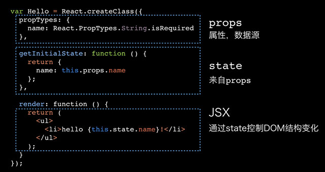 这是一个简单完整的React组件(类),props 主要作用是提供数据来源,可以简单的理解为 props 就是构造函数的参数。 state 唯一的作用是控制组件的表现,用来存放会随着交互变化状态,比如开关状态等。JSX 做的事情就是根据 state 和 props 中的值,结合一些视图层面的逻辑,输出对应的 DOM 结构。
