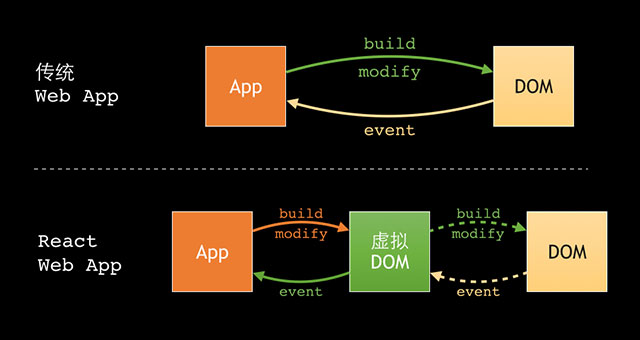 React Web App:是通过虚拟DOM来交互。虚拟DOM是在DOM的基础上建立了一个抽象层,我们对数据和状态所做的任何改动,都会被自动且高效的同步到虚拟DOM,最后再批量同步到DOM中。(渲染效率高)