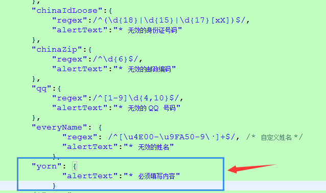 接下来要设置自定义提示信息了,找到jquery.validationEngine-zh_CN.js文件,然后在最下面自己跟随一个对象,函数名在前面,后面alertText后跟你要提示的信息。这样就OK了。