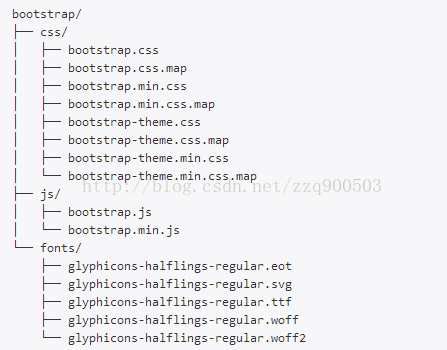 如上图所示,可以看到已编译的 CSS 和 JS(bootstrap.*),以及已编译压缩的 CSS 和 JS(bootstrap.min.*)。同时也包含了 Glyphicons 的字体,这是一个可选的 Bootstrap 主题。