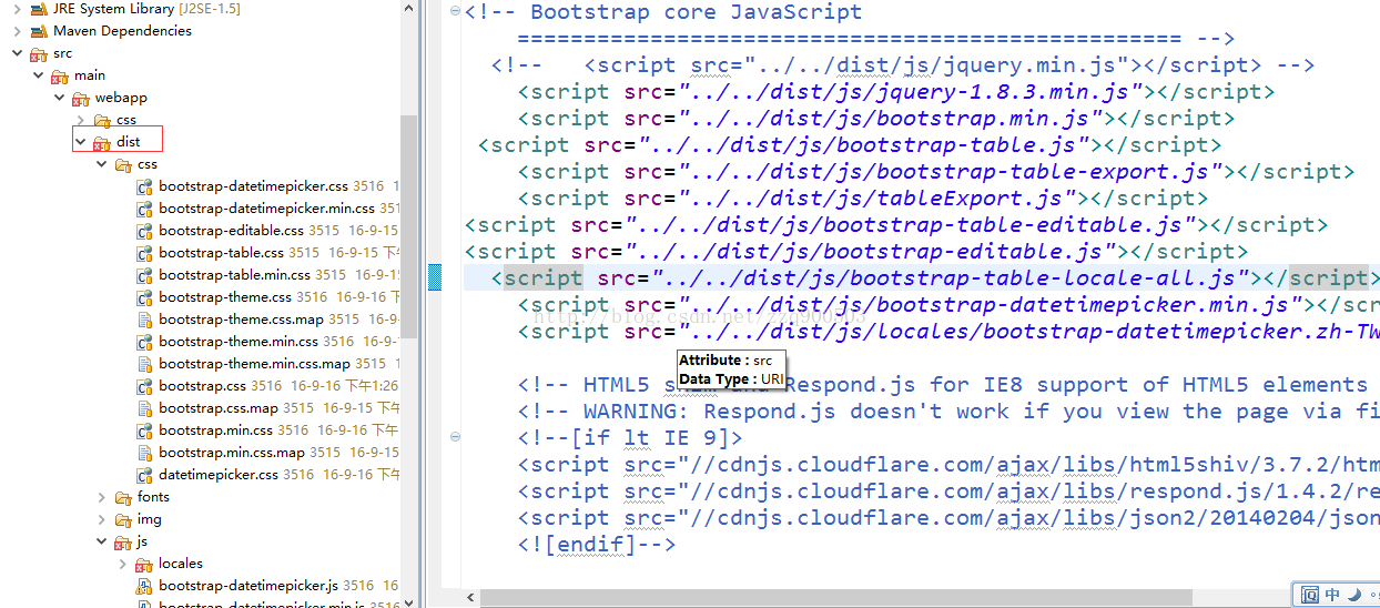 下图是把bootstrap文件夹放入java项目中在myeclipse中的样子: