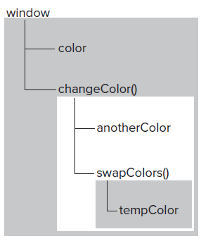 我们可以发现,作用域链是由内向外扩展的,我们可以通过作用域访问外部环境的变量和函数,但是外部环境中访问不到内部环境的变量和函数。我们在swapColors中用到了全局变量color,但是它也不是一下子就找到color的,它有一个由内向外的查找过程: