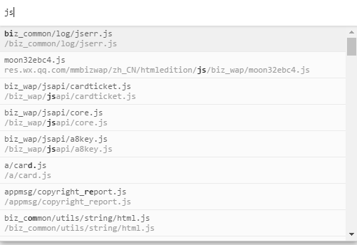 我很诧异,为什么已经开启了Disable cache,js只加载了一个,而且体积这么小。接着,我按住Ctrl+O进行资源文件查找,发现我被“忽悠”了。其实根本就不止一个js文件。