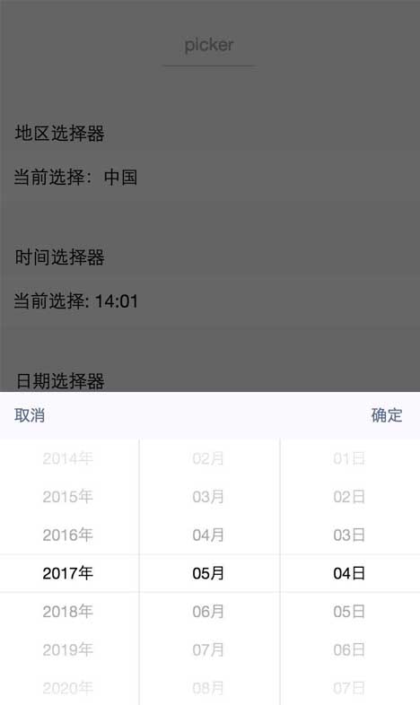 <picker mode="date" value="{{date}}" start="2015-09-01" end="2017-09-01" bindchange="bindDateChange">