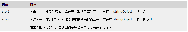 一个新的字符串,该字符串值包含 stringObject 的一个子字符串,其内容是从 start 处到 stop-1 处的所有字符,其长度为 stop 减 start。