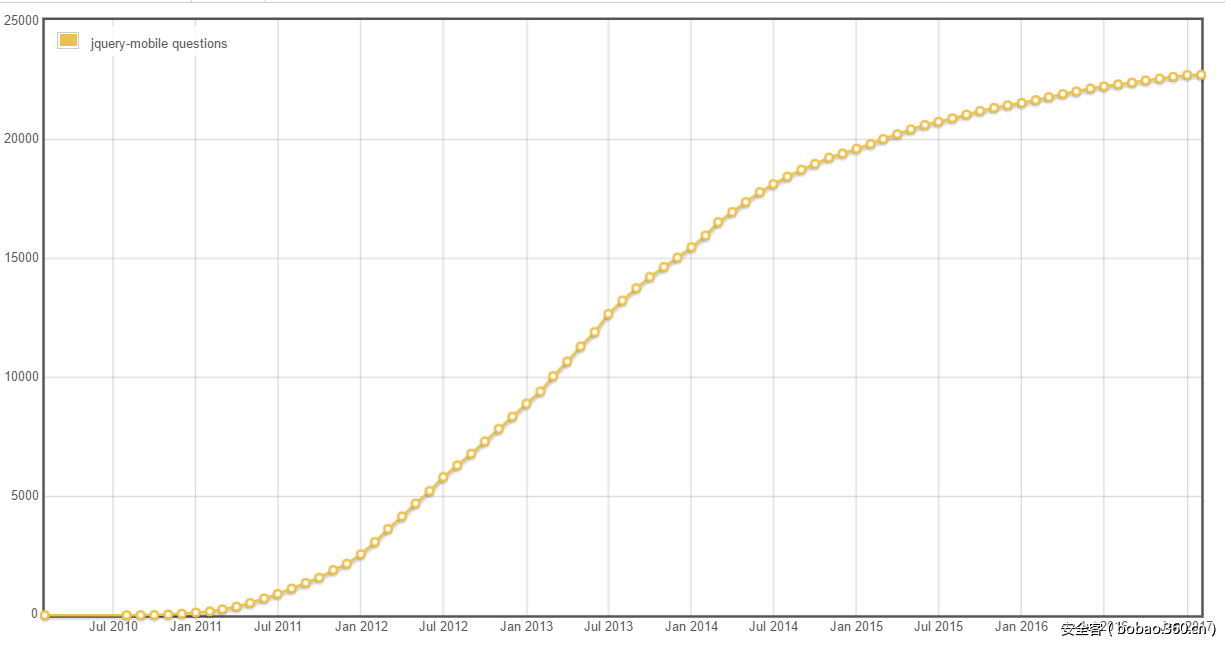 jQuery Mobile是目前一个非常热门的项目,下图显示的是Stack Overflow上关于jQuery Mobile的提问数量增长情况: