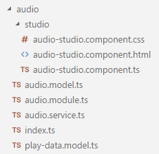 考虑到音频播放是个比较通用的服务,决定将其创建为一个单独的模块AudioModule,并且在里面新增音频服务主文件audio.service.ts,通用的音频控制中心组件audio-studio.component.ts,作为辅助的TS接口文件play-data.model.ts与audio.model.ts。