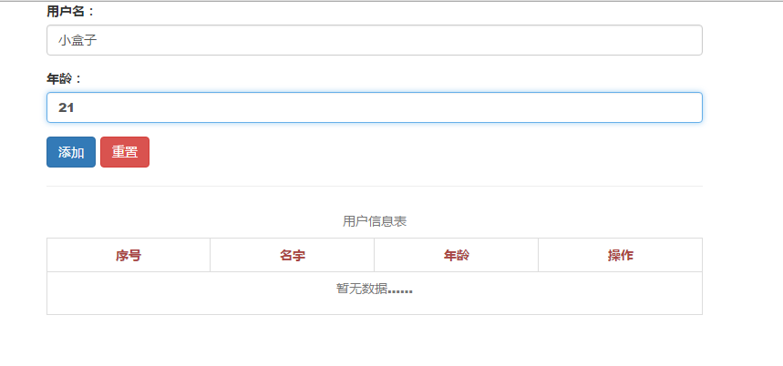 效果如下图所示,输入用户名和年龄,点击添加,数据会自动添加到下面的用户信息表内。当没有数据时,用户信息表显示:暂无数据……,当有数据时,显示 删除全部 按钮,这里为了方便快捷,我没有做删除按钮的弹出框,所以 点击删除按钮 会直接删除掉当前这条数据。