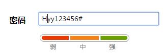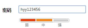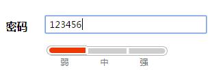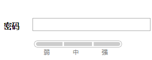 <table style="width:320px;margin:40px auto;"> <tr> <th>密码</th> <td><span class="tbl-txt"><input id="pass" class="input-style" size="30" maxlength="30" name="pass" type="text" /></span></td> </tr> <tr> <th></th> <td id="level" class="pw-strength"> <div class="pw-bar"></div> <div class="pw-bar-on"></div> <div class="pw-txt"> <span>弱</span> <span>中</span> <span>强</span> </div> </td> </tr> </table>