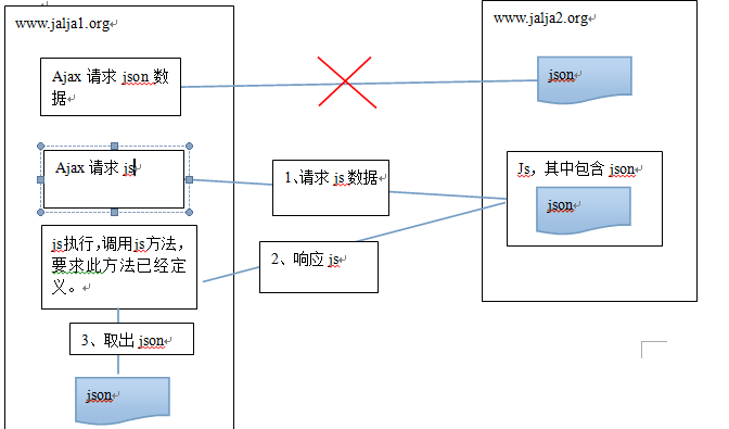 原理:浏览器在js请求中,是允许通过script标签的src跨域请求,可以在请求的结果中添加回调方法名,在请求页面中定义方法,既可获取到跨域请求的数据。(js请求的不是一个单纯的json数据而是一段包含json数据的js脚本)