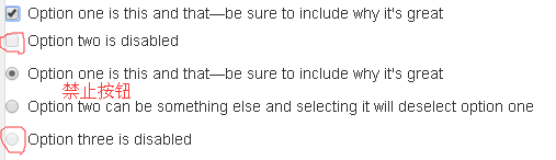 <!DOCTYPE HTML> <html> <head> <link rel="stylesheet" href="/stylesheets/bootstrap.min.css" rel="external nofollow" rel="external nofollow" rel="external nofollow" rel="external nofollow" rel="external nofollow" rel="external nofollow" rel="external nofollow" rel="external nofollow" rel="external nofollow" rel="external nofollow" rel="external nofollow" rel="external nofollow" rel="external nofollow" rel="external nofollow" rel="external nofollow" rel="external nofollow" rel="external nofollow" > </head> <body> <div class="checkbox"> <label> <input type="checkbox" value=""> Option one is this and that—be sure to include why it's great </label> </div> <div class="checkbox disabled"> <label> <input type="checkbox" value="" disabled=""> Option two is disabled </label> </div> <p></p><div class="radio"> <label> <input type="radio" name="optionsRadios" id="optionsRadios1" value="option1" checked=""> Option one is this and that—be sure to include why it's great </label> </div><p></p> <p></p><div class="radio"> <label> <input type="radio" name="optionsRadios" id="optionsRadios2" value="option2"> Option two can be something else and selecting it will deselect option one </label> </div><p></p> <p></p><div class="radio disabled"> <label> <input type="radio" name="optionsRadios" id="optionsRadios3" value="option3" disabled=""> Option three is disabled </label> </div> </body> </html>