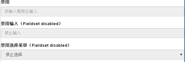 <!DOCTYPE HTML> <html> <head> <link rel="stylesheet" href="/stylesheets/bootstrap.min.css" rel="external nofollow" rel="external nofollow" rel="external nofollow" rel="external nofollow" rel="external nofollow" rel="external nofollow" rel="external nofollow" rel="external nofollow" rel="external nofollow" rel="external nofollow" rel="external nofollow" rel="external nofollow" rel="external nofollow" rel="external nofollow" rel="external nofollow" rel="external nofollow" rel="external nofollow" > </head> <body> <form class="form-horizontal" role="form"><div class="form-group"> <label for="inputPassword" class="col-sm-2 control-label">禁用</label> <div class="col-sm-10"> <input class="form-control" id="disabledInput" type="text" placeholder="该输入框禁止输入..." disabled> </div> </div> <fieldset disabled> <div class="form-group"> <label for="disabledTextInput" class="col-sm-2 control-label">禁用输入(Fieldset disabled)</label> <div class="col-sm-10"> <input type="text" id="disabledTextInput" class="form-control" placeholder="禁止输入"> </div> </div> <div class="form-group"> <label for="disabledSelect" class="col-sm-2 control-label">禁用选择菜单(Fieldset disabled)</label> <div class="col-sm-10"> <select id="disabledSelect" class="form-control"> <option>禁止选择</option> </select> </div> </div> </fieldset> </form> </body> </html>