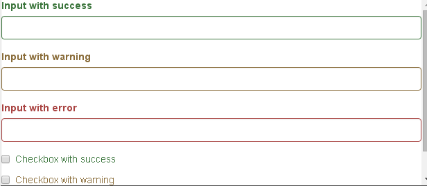 <!DOCTYPE HTML> <html> <head> <link rel="stylesheet" href="/stylesheets/bootstrap.min.css" rel="external nofollow" rel="external nofollow" rel="external nofollow" rel="external nofollow" rel="external nofollow" rel="external nofollow" rel="external nofollow" rel="external nofollow" rel="external nofollow" rel="external nofollow" rel="external nofollow" rel="external nofollow" rel="external nofollow" rel="external nofollow" rel="external nofollow" rel="external nofollow" rel="external nofollow" > </head> <body> <div class="form-group has-success"><label class="control-label" for="inputSuccess1">Input with success</label> <input type="text" class="form-control" id="inputSuccess1"> </div> <div class="form-group has-warning"> <label class="control-label" for="inputWarning1">Input with warning</label> <input type="text" class="form-control" id="inputWarning1"> </div> <div class="form-group has-error"> <label class="control-label" for="inputError1">Input with error</label> <input type="text" class="form-control" id="inputError1"> </div> <div class="has-success"> <div class="checkbox"> <label> <input type="checkbox" id="checkboxSuccess" value="option1">Checkbox with success</label> </div> </div> <div class="has-warning"> <div class="checkbox"> <label> <input type="checkbox" id="checkboxWarning" value="option1">Checkbox with warning</label> </div> </div> <div class="has-error"> <div class="checkbox"> <label> <input type="checkbox" id="checkboxError" value="option1">Checkbox with error</label> </div> </div> </body> </html>
