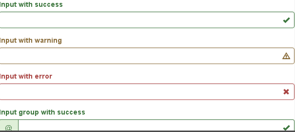 <!DOCTYPE HTML> <html> <head> <link rel="stylesheet" href="/stylesheets/bootstrap.min.css" rel="external nofollow" rel="external nofollow" rel="external nofollow" rel="external nofollow" rel="external nofollow" rel="external nofollow" rel="external nofollow" rel="external nofollow" rel="external nofollow" rel="external nofollow" rel="external nofollow" rel="external nofollow" rel="external nofollow" rel="external nofollow" rel="external nofollow" rel="external nofollow" rel="external nofollow" > </head> <body> <div class="form-group has-success has-feedback"><label class="control-label" for="inputSuccess2">Input with success</label> <input type="text" class="form-control" id="inputSuccess2" aria-describedby="inputSuccess2Status"> <span class="glyphicon glyphicon-ok form-control-feedback" aria-hidden="true"></span> <span id="inputSuccess2Status" class="sr-only">(success)</span> </div> <div class="form-group has-warning has-feedback"> <label class="control-label" for="inputWarning2">Input with warning</label> <input type="text" class="form-control" id="inputWarning2" aria-describedby="inputWarning2Status"> <span class="glyphicon glyphicon-warning-sign form-control-feedback" aria-hidden="true"></span> <span id="inputWarning2Status" class="sr-only">(warning)</span> </div> <div class="form-group has-error has-feedback"> <label class="control-label" for="inputError2">Input with error</label> <input type="text" class="form-control" id="inputError2" aria-describedby="inputError2Status"> <span class="glyphicon glyphicon-remove form-control-feedback" aria-hidden="true"></span> <span id="inputError2Status" class="sr-only">(error)</span> </div> <div class="form-group has-success has-feedback"> <label class="control-label" for="inputGroupSuccess1">Input group with success</label> <div class="input-group"> <span class="input-group-addon">@</span> <input type="text" class="form-control" id="inputGroupSuccess1" aria-describedby="inputGroupSuccess1Status"> </div> <span class="glyphicon glyphicon-ok form-control-feedback" aria-hidden="true"></span> <span id="inputGroupSuccess1Status" class="sr-only">(success)</span> </div> </body> </html>
