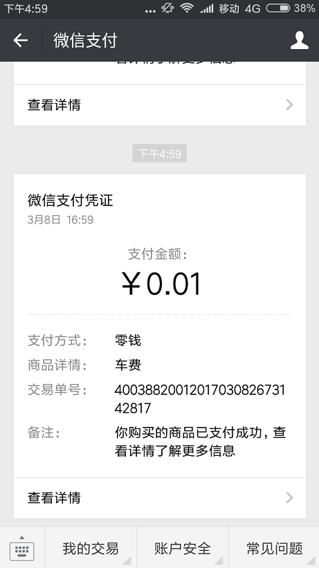 这样简单3步,小程序的微信支付功能就接上了,下面是测试的支付效果图