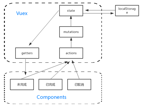 所有组件都是调用actions,分发mutation去修改state,然后state经过getter又更新到各个组件里。state又通过localStorage存储数据到本地,下次重新打开时再读取保存的数据。