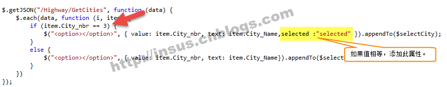 如果你需要在显示时,绑定一个选择值,那怎样实现呢?很简单的,在$.each时,判断一下: