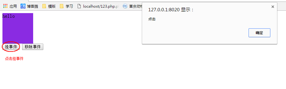 <body> <div id="aa" style="width: 100px; height: 100px; background-color: blueviolet;">hello</div> <!--<input type="text" id="shao" />--> <input type="button" id="btn1" value="挂事件" /> <input type="button" id="btn2" value="移除事件" /> </body>